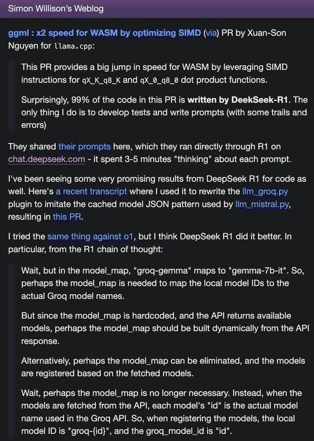 Dylan Patel, da SemiAnalysis, apontou isso desde junho. Isso não significa o fim da necessidade de mais poder computacional, ou que o player mais intensivo em capital não vencerá. DeepSeek teve que buscar alternativas devido as restrições de importações de chips NVIDIA impostas pelos EUA. Isso fez com que eles acabassem encontrando um caminho mais eficiente: